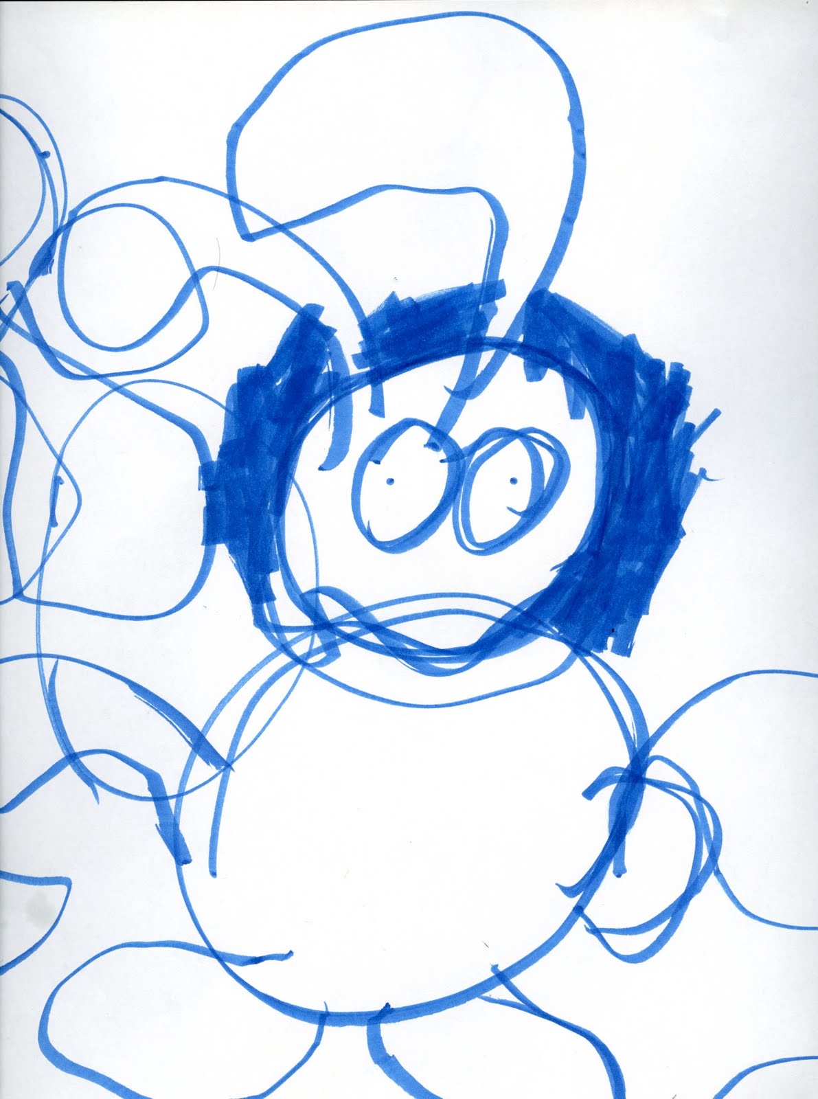 Листая книжку, рассказывает длинную сказку - "про мальчика и маленького постороннего человека, который жил у него под столом".