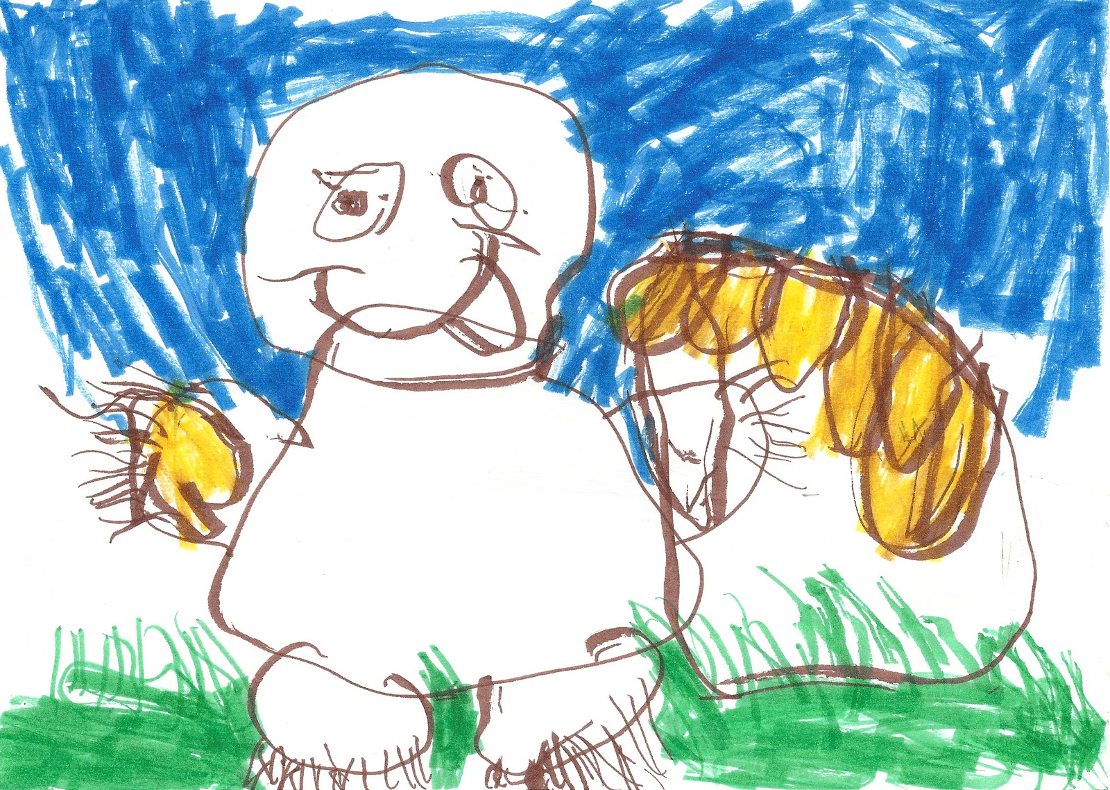 Утром Пингвиненок очень спешил. Он всю ночь ворочался. Он спешил пойти гулять со своей подружкой ровно в одну минуту и в четыре секунды. За минуточку он успел почистить зубы, позавтракать, снять фартук, надеть тапочки, открыть дверь, запереть ключиком, положить его в корзинку и скорее помчался вприпрыжку. Но он успел еще минуточку посмотреть на цветок, понюхать и собрать все цветы, которые росли на этой поляне. И пошел. Он подарил цветы и обнял. И вот они вместе попили чай. Они друг другу подарили торты, съели их. Друг у нее даже переночевал. А потом попрощались друг с другом, подарили подарки, а потом они сидели дома и смотрели книжку. Счастье! Здорово! Но он сидел и хотел нарисовать четырех пингвинят. Сначала рисовал головку, глазки и ротик. Но боялся, что дождь пойдет. Хотел написать: «Длинная история». Но он так торопился домой, потому что боялся, что дождь пойдет, что в голове у него мысли перепутались и получилось: «Д-е-с-и-я». Что это за слово? Потом он посмотрел в книжке одну картинку и засмеялся, поставил букет в вазочку. И стал играть. И все заиграли. И все-таки конец.